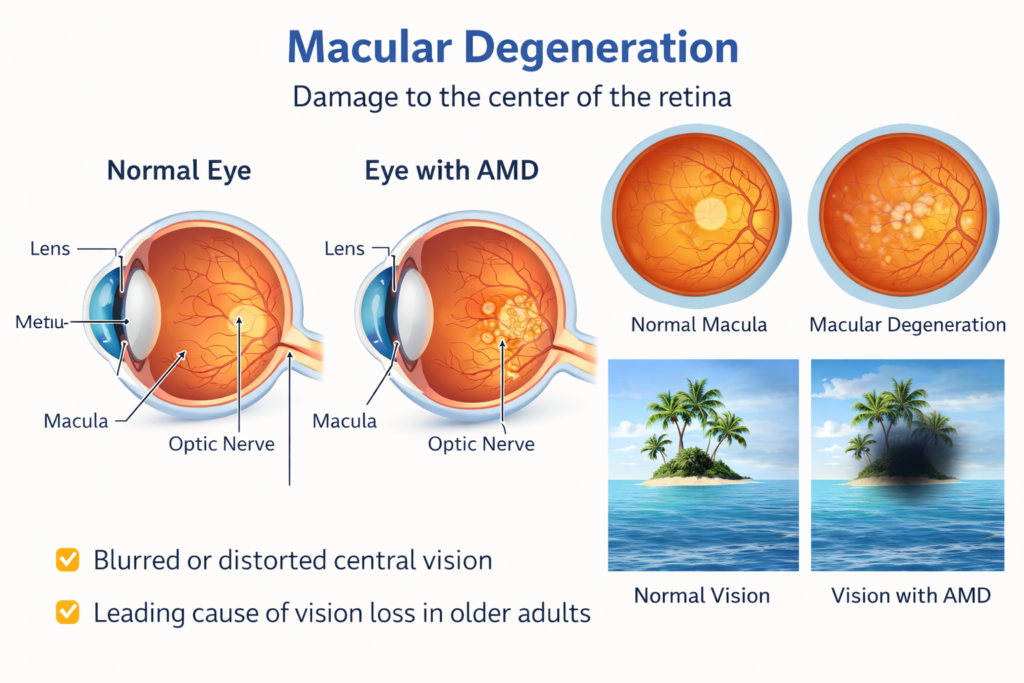 Makula dejenerasyonu genellikle yaşa bağlı makula dejenerasyonu (AMD) olarak ortaya çıkar ve halk arasında sarı nokta hastalığı olarak da bilinir.